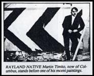 Attach photo: “artist in front of recent painting w/ladder” “Rayland native Martin Timko, now of Columbus, stands before one of his recent paintings.”